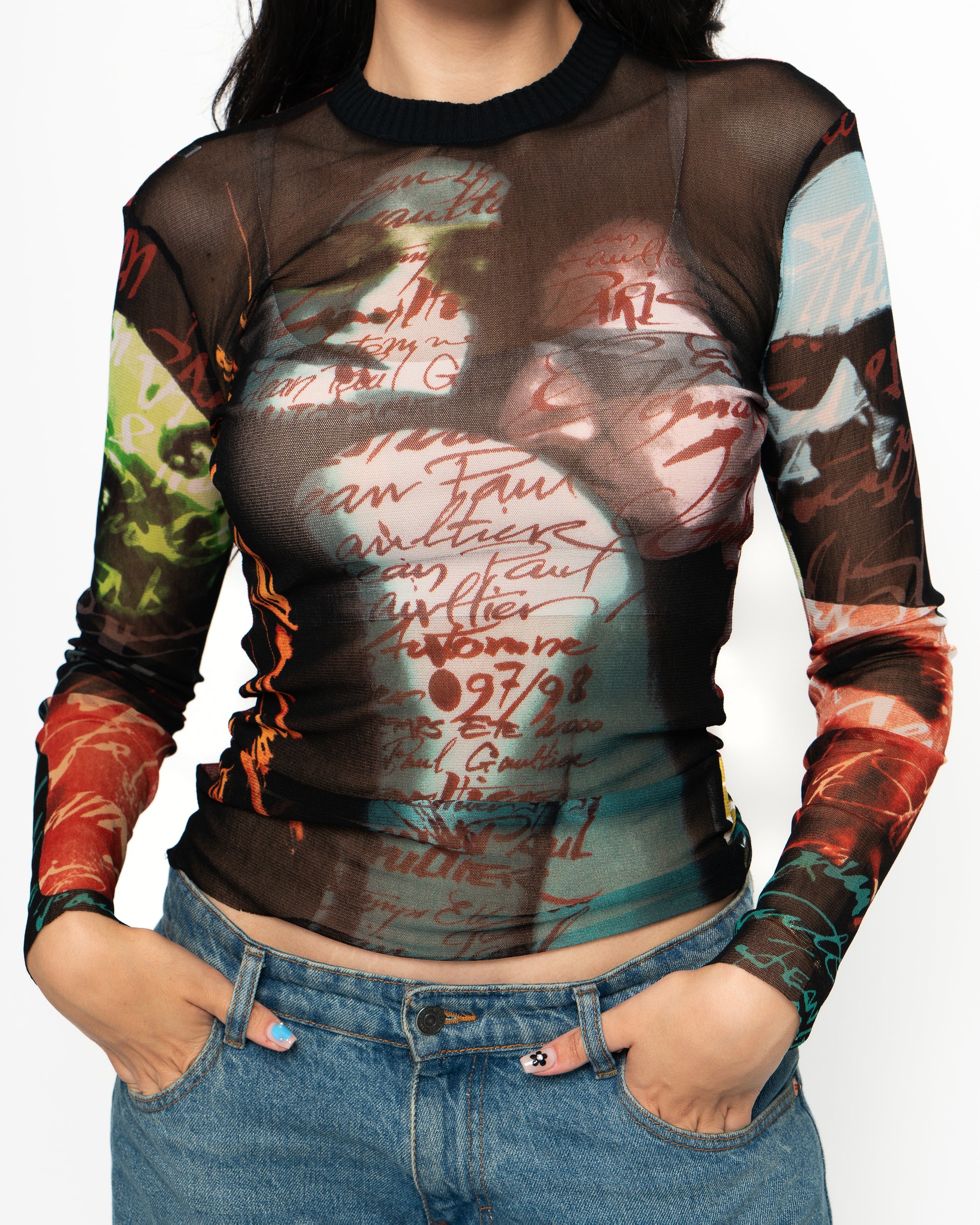 Jean Paul Gaultier Multicolour Faces Tattoo Effect Long Sleeved Top with Ribbed Collar.